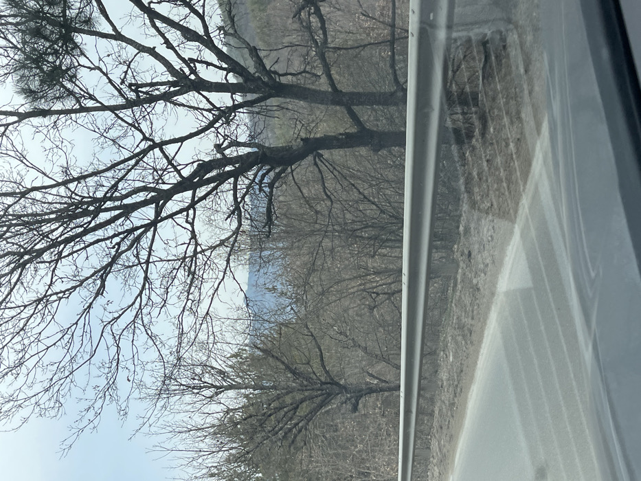 This image depicts a roadside view in Kostandovo, Bulgaria, under an overcast sky, likely during late winter or early spring. The foreground shows a grey paved road surface and the bottom edge of what appears to be a vehicle's dashboard, with reflections on a windshield. A silver-colored metal guardrail extends horizontally across the mid-ground, separating the road from a sloping embankment. Beyond the guardrail, the terrain is covered with dry, sparse vegetation and numerous deciduous trees with bare, dark branches. In the background, successive layers of hills or mountains are visible, appearing hazy and bluish against the lighter sky. No individuals or active subjects are present.