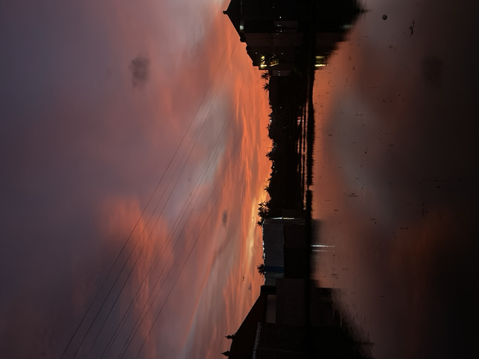 This image depicts a sunset over a body of water in Celuk, Indonesia. The sky, occupying the upper two-thirds of the frame, displays a dramatic gradient of vibrant orange and red hues at the horizon, transitioning upwards into purple and dark blue. Scattered clouds are visible, particularly in the central and upper-left portions of the sky. Multiple dark, parallel utility lines traverse horizontally across the upper mid-section of the sky. A small, dark silhouette, possibly an avian figure, is visible in the upper-left quadrant against the brighter sky. The lower half of the image features a calm body of water, likely a flooded rice paddy or pond, which reflects the sky's vivid colors in muted, darker tones. Irregular clusters of dark vegetation emerge from the water, breaking its reflective surface. A small, light-colored spherical object floats on the water's surface in the lower right. On the left side of the scene, the dark silhouette of a building with a traditional-style roof is visible, alongside other blocky, dark structures. One structure exhibits a vertical strip of reflected artificial light. On the right, a multi-story building is silhouetted against the vibrant sky, with multiple windows reflecting internal artificial light sources. A dense line of silhouetted palm trees and other vegetation spans the distant horizon, framing the central water body. No individuals or specific actions are discernible within the scene.