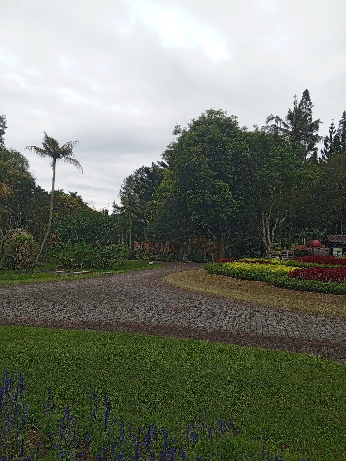 A cobblestone path curves through a lush garden under a cloudy sky. Vivid red and yellow flower beds border the path, transitioning into a grassy lawn in the foreground. A lone palm tree stands tall amidst other trees and vegetation, creating a dense backdrop. A small structure with a red umbrella is subtly visible in the distance.