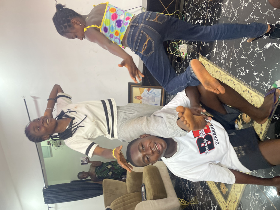 This image, captured indoors in Idah, Nigeria, depicts three individuals engaged in a dynamic, playful interaction