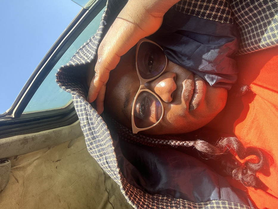 An adult female is depicted in a close-up, seated inside a vehicle under direct sunlight in Rimau, Nigeria