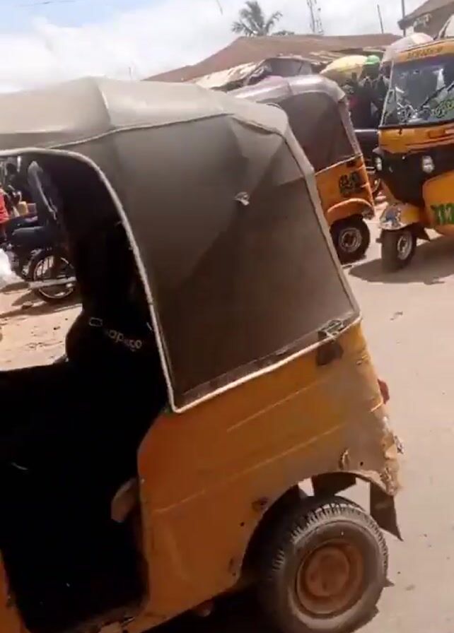 street scene in what appears to be a developing country, possibly Africa. Several yellow auto-rickshaws, also known as "keke" or "tuk-tuks," are visible, with passengers inside. One person wears a blue shirt with a black jacket, holding a book. The rickshaws are parked near a street with other people, motorcycles, and open-air stalls. A beat-up white minibus is also visible, parked close to the rickshaws, with faded paint and a damaged front bumper. Passengers are visible inside. The overall impression is that of a bustling transportation hub in a busy urban area.