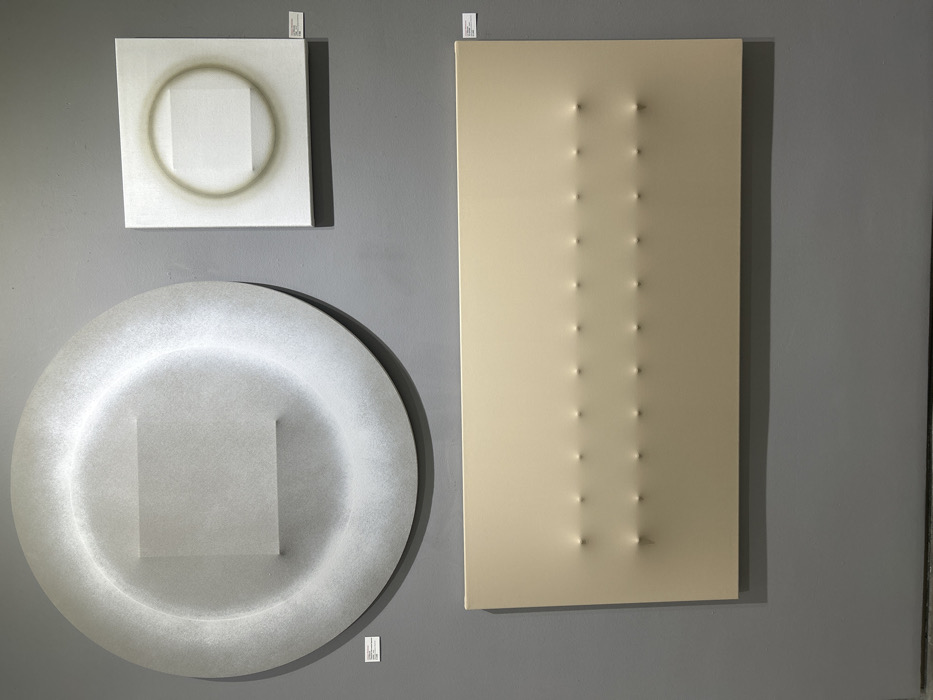Three contemporary artworks are displayed against a gray wall. The top left is a square canvas with a faint circular shadow around a central white square. Below it, a larger circular piece mirrors the square within a circle motif in grayscale. To the right, a rectangular canvas in a pale beige features two vertical rows of indentations, creating a subtle textured effect. Small, rectangular identification tags hang above or below each artwork.
