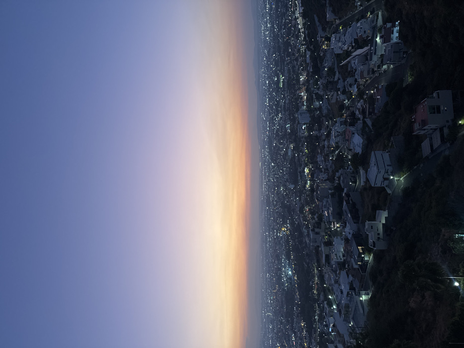 An aerial view of a city at dusk. The sky transitions from a dark blue to a vibrant orange near the horizon. City lights twinkle below. On the right side of the image, homes and buildings dot a hillside. Vegetation appears dark and lush along the extreme right edge. The overall perspective gives a sense of scale and depth to the urban landscape.