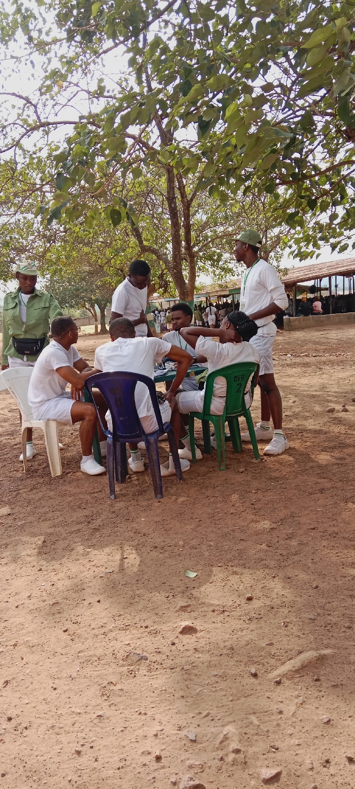 The image depicts an outdoor scene in Iyara, Nigeria, under an open sky with partial tree cover. Seven individuals are visible on a reddish-brown dirt ground with scattered small rocks. On the far left, one female stands, facing towards the right. She wears a long-sleeved olive-green shirt, matching trousers, a green cap, and a black fanny pack around her waist. Six other individuals wear a white uniform consisting of a white short-sleeved top (t-shirt or polo shirt), white shorts, white socks with green stripes, and white sneakers. - Four individuals are seated around a small, light-colored square table. One male sits on a white plastic chair, facing the table. Another male sits on a blue plastic chair, his back partially towards the viewer. A third male sits on a green plastic chair, facing the table. A female sits on another green plastic chair, with her back to the viewer, her hands clasped behind her neck. The back of her chair bears the inscription "NYSC" and "2". These four individuals appear to be interacting around the table. - One male in the white uniform stands to the right of the seated group, facing right, wearing a green cap. - Another male in the white uniform stands behind the table, facing downwards towards the seated group. Overhead, several trees with green foliage and visible branches provide shade. In the background, to the right, are long, open-sided structures with corrugated metal roofs, suggestive of a camp or barracks. More individuals, also in white uniforms, are visible near these structures in the distance. The lighting is bright, indicative of daylight.