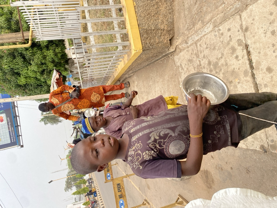 The image depicts a street scene in Shaba, Nigeria, featuring three individuals on a concrete sidewalk. In the foreground, a young male child, approximately 8-12 years old, with short dark hair and a dark complexion, wears a dark purple patterned short-sleeved shirt and dark trousers. He holds an empty, shiny silver-colored metal bowl in his right hand and has a thin yellow band on his right wrist. His gaze is directed slightly to the left of the frame. Behind him, slightly to the right, stands another male child, approximately 5-8 years old, also with a dark complexion. He wears a brown long-sleeved tunic over a yellow garment and a blue and yellow patterned kufi cap. His right hand is partially raised. In the background, an adult male stands near a light-colored motorcycle. He is dressed in an orange long-sleeved patterned outfit (top and trousers) and carries a black shoulder bag. He appears to be looking down or to his side. The environment includes a concrete sidewalk with visible stains and cracks. To the right, a low white metal fence with a yellow concrete base separates the sidewalk from a grassy area with a large green-leafed tree (possibly a mango tree). Two wooden barriers with "MN NO ARKIN" stenciled in dark blue are positioned on the sidewalk to the left. In the upper background, an overhead billboard displays "UNION BANKING" alongside Mastercard and Visa logos. A paved road with other vehicles and distant buildings is visible to the left. The sky is bright and appears hazy or overcast.