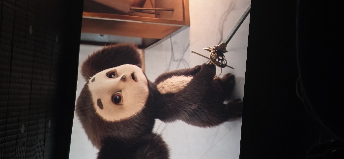A charming animated panda character lies on its back on a light marble surface. The panda's face is a soft cream color with brown markings around the eyes and nose. The rest of its body is covered in dark brown fur. It holds a decorative sword in its paws. Above the panda, there's a glimpse of a wooden cabinet. The image is partially obscured by darkness on the left and right sides, with some textured material visible on the left edge.
