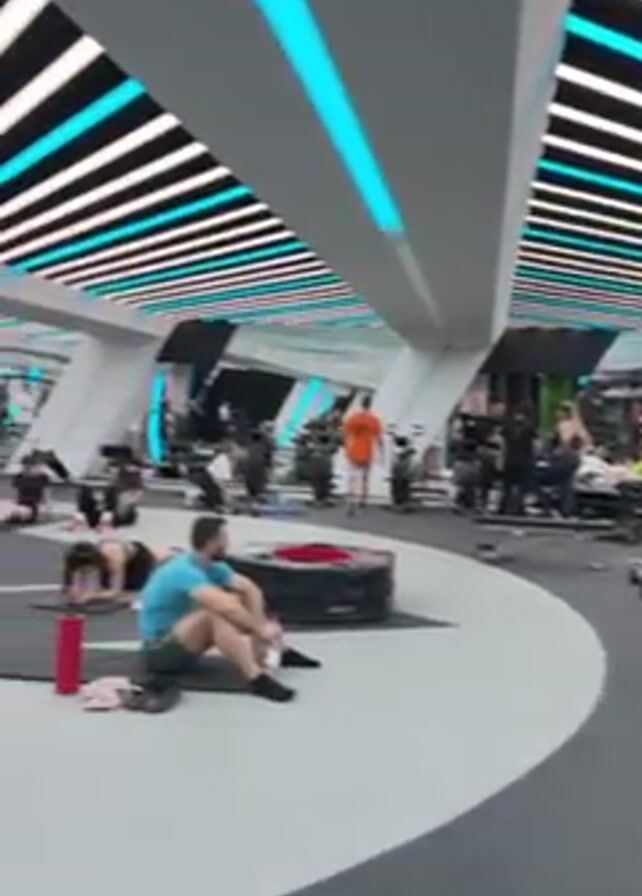 spacious, modern gym with a high ceiling featuring white and black horizontal stripes, illuminated by blue neon lights. The floor is predominantly grey with white and black accents in curved patterns. Multiple people are present, engaging in various fitness activities. Some are sitting on exercise mats, while others are using workout equipment or performing floor exercises. Gym equipment, including weights, benches, and machines, is visible throughout the space. The overall environment is brightly lit and appears to be a well-equipped and actively used fitness center.