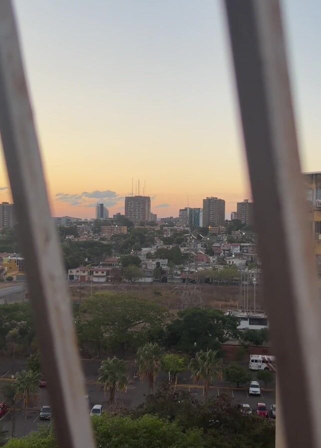 cityscape during the early stages of dusk, viewed through a window grill. The sky transitions from light blue at the top to a pale orange near the horizon. Several high-rise buildings dot the skyline. In the foreground, a mix of residential houses and trees fill the landscape. An electricity pylon is visible in the midground. The camera slowly moves, revealing more of the city. There are no people visible in the scene.