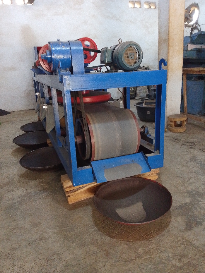 The image depicts an indoor industrial setting within Olomoda, Nigeria, featuring a large, blue-painted processing machine. The machine, constructed with a square-tube metal frame, is equipped with multiple red pulleys, black drive belts, and large, dark grey cylindrical rollers. An electric motor, with a green casing and a protective grille, is mounted atop the frame, connected via a belt to the primary drive mechanism. The machine's base rests on several stacked wooden planks or pallets. Positioned on the concrete floor directly beneath the machine's lower sections are at least five dark, shallow, circular metal pans or trays, likely intended to collect processed material. The background reveals light-colored walls, with three rectangular openings high on the left wall and a vertical support column on the right. Other background elements include a small, light-colored wooden stool, a dark tub or container, and indistinct objects further back. No individuals are present in the scene, and the machine appears to be stationary. The floor is a dusty, light grey concrete.