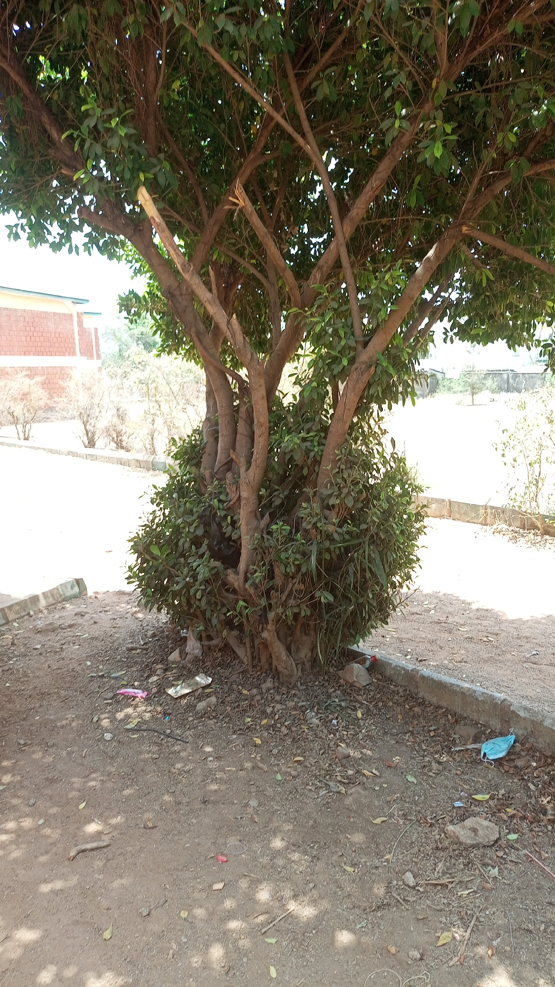 The image displays a multi-trunked tree with dense green foliage, positioned on dry, reddish-brown earth in Abuja, Nigeria. Multiple thick, gnarled trunks emerge from the ground, branching upwards; some upper branches show exposed, fractured wood. The base of the tree is enveloped by a cluster of smaller green shrubs and undergrowth. The surrounding ground is unpaved, consisting of dirt and scattered dry leaves, small stones, and various litter items including a light blue disposable face mask, a silver foil wrapper, and a pink plastic object. A concrete curb runs along the ground in the mid-foreground, delineating the dirt area. To the left, a building with red brick walls and a light-colored upper section is partially visible. The background features sparse, dry vegetation and an open, bright sky, with faint outlines of distant structures. No individuals are present, and no actions or interactions are depicted.