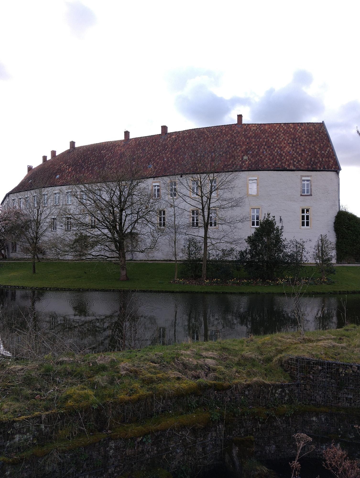The scene depicts Schloss Burgsteinfurt in Burgsteinfurt, Germany, under an overcast sky. The primary subject is a large, multi-story building with a light-grey or white stucco facade and a reddish-brown tiled roof. Seven brick chimneys are visible along the roofline. The building's walls feature numerous rectangular windows, mostly with white frames. In front of the building, a manicured green lawn extends to a dark, reflective body of water, likely a moat, which mirrors the cloudy sky and surrounding vegetation. Several bare deciduous trees with dark, gnarled branches are positioned between the building and the water. Clumps of yellow-flowering plants, consistent with daffodils, are visible along the water's edge and near the building's foundation. A tall, sculpted dark green hedge is present at the far right corner of the building. The immediate foreground reveals a moss and grass-covered earthen bank, supported by a gabion wall constructed from wire cages filled with rocks, which borders the dark water. No human figures or discernible activities are present within the frame. The sky is largely white and light grey with diffuse clouds.