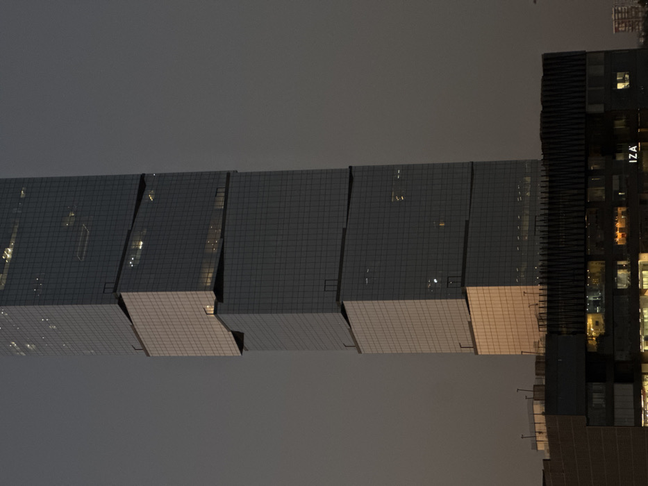 A view of a modern architectural marvel, most likely a skyscraper at night, displaying a series of stacked or stepped box-like sections. These sections have gridded facades with subtle light reflections, suggesting windows. Adjacent to this is a taller, darker building with illuminated windows and a visible “IZA” logo, adding a commercial aspect to the scene. The background is a dark, hazy sky, providing minimal contrast.