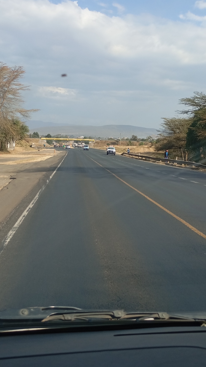 The image, captured from within a vehicle, displays a multi-lane asphalt highway extending into the distance under a partly cloudy sky. The dashboard and a portion of the windshield wipers are visible in the lower foreground. The highway features two lanes in the direction of travel, separated by a solid yellow line. A solid white line delineates the paved left shoulder from the dry, light-brown earth verge. Sparse, dry-looking trees and shrubs line both sides of the road. Distant, low-lying mountains or hills form the horizon. Several vehicles are present on the highway. A white sedan, possibly a taxi, is in the right lane in the mid-distance. Multiple other vehicles, including a white van, are further ahead. A yellow overhead gantry sign structure spans the highway in the far distance. An elevated road or bridge is visible on the left side of the highway further down the road. Two individuals are present on the right shoulder of the road, near a metal guardrail. One person, dressed in light blue and dark attire, stands near the white sedan. Another individual, wearing a hat and blue clothing, is positioned further down the road near the guardrail. A small, dark, blurred object is visible in the upper-center portion of the sky. This scene is located in the City of London ward, Kenya.