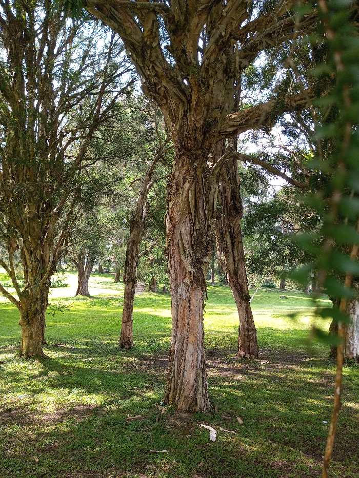 A sun-dappled grove of trees, mainly evergreen, occupies a grassy area. The central tree is thick, its trunk contorted, with two limbs drooping down. Other trees with peeling bark are scattered, their canopies forming a loose roof. A few strands of leaves hang to the right of the frame. Sunlight filters through the trees, creating dappled shadows on the grass below.