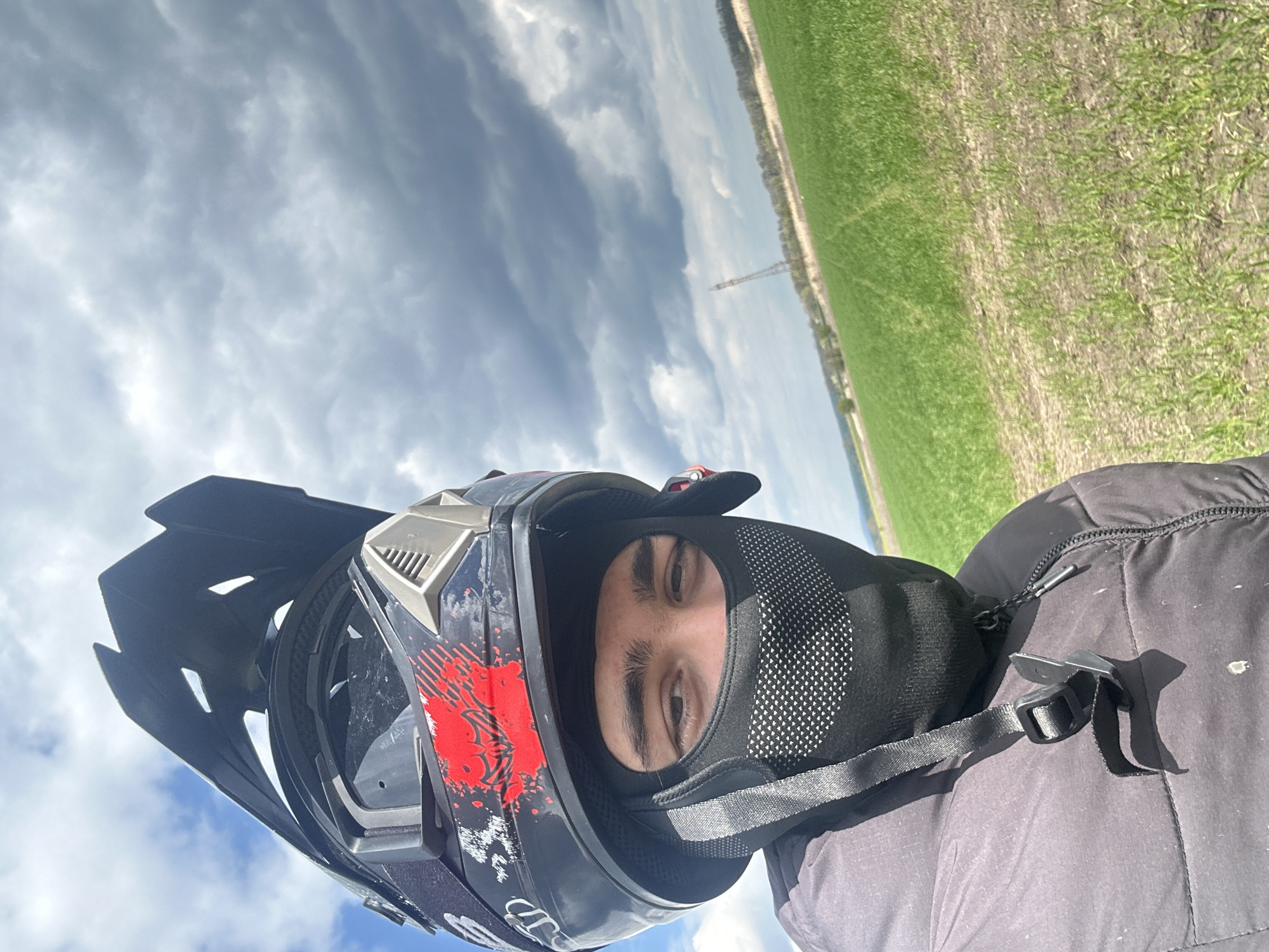 A selfie taken outdoors shows an individual wearing a black balaclava and a black, red, and grey motocross helmet