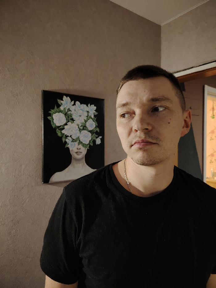 An indoor scene in the city of Марковский, Russia, displays a male individual in the foreground, positioned right of center. The male, appearing to be between 20 and 35 years old, has short dark hair and is wearing a plain black t-shirt with a thin silver-colored chain around his neck. His head is turned approximately 45 degrees to his right, with his gaze directed off-camera towards the upper right. To the left of the male, a rectangular painting is affixed to a textured beige wall. The painting depicts a female bust with a cluster of light blue and white flowers and green leaves obscuring her head, set against a black background. The background to the right reveals a partially visible doorway opening into an adjacent room with patterned wallpaper and indistinct objects.