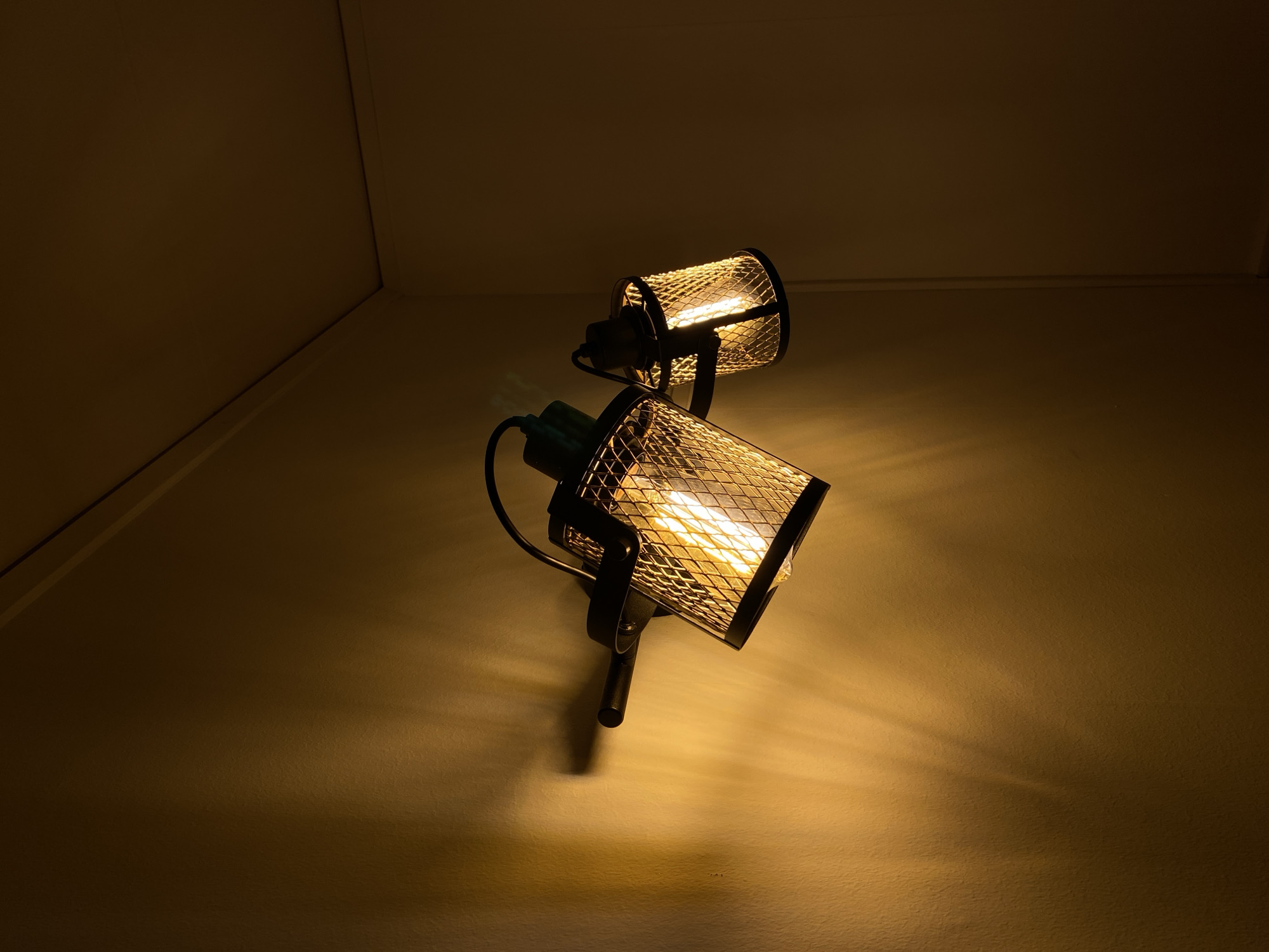 The scene depicts an interior corner of a building in Björklinge, Sweden, illuminated by two wall-mounted industrial-style light fixtures. The fixtures feature cylindrical black metal housings with protective wire mesh caging surrounding exposed, glowing filament bulbs, which emit a warm, yellowish-orange light. They are secured to a dark horizontal bar extending from the textured, light-colored wall. The light casts distinct patterns and shadows on the wall, highlighting its texture. The area to the right of the lights and towards the ceiling is dimly lit, revealing the junction of two walls and the ceiling line. No people, other objects, or specific room identifiers are present. The primary action is the illumination provided by the active light fixtures.