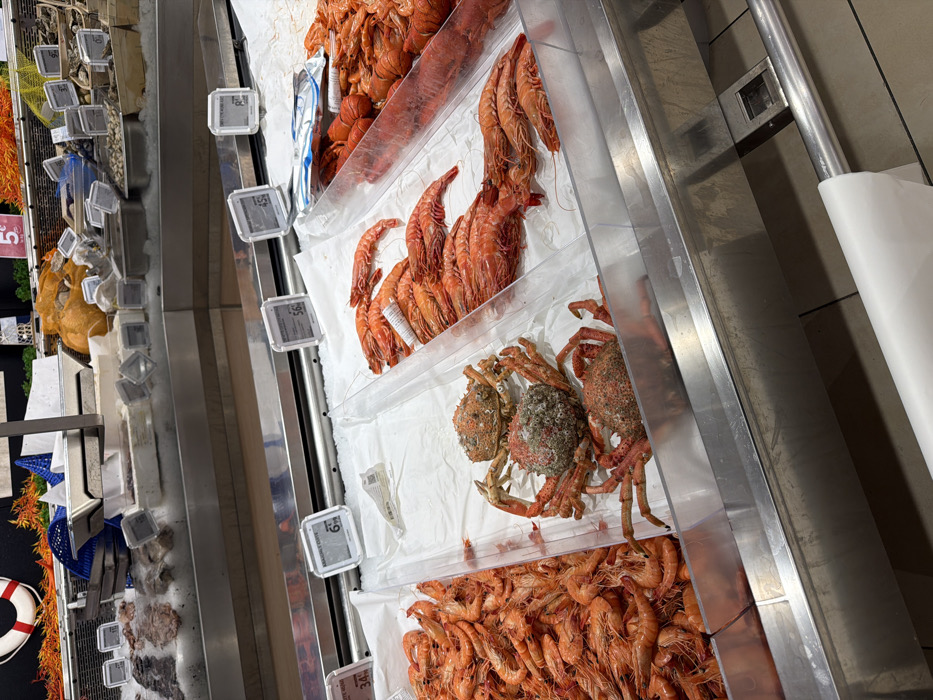 A supermarket display case holds a variety of seafood. The top shelf showcases crawfish and shrimp. The second level features large shrimp. Crabs are on the third tier, and the bottom shelf holds a large quantity of small shrimp. Price tags are visible along the edge of the display.