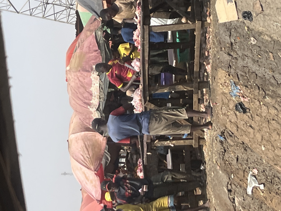 The scene depicts an outdoor meat market in Iddo Tudunwada, Nigeria, under bright daylight