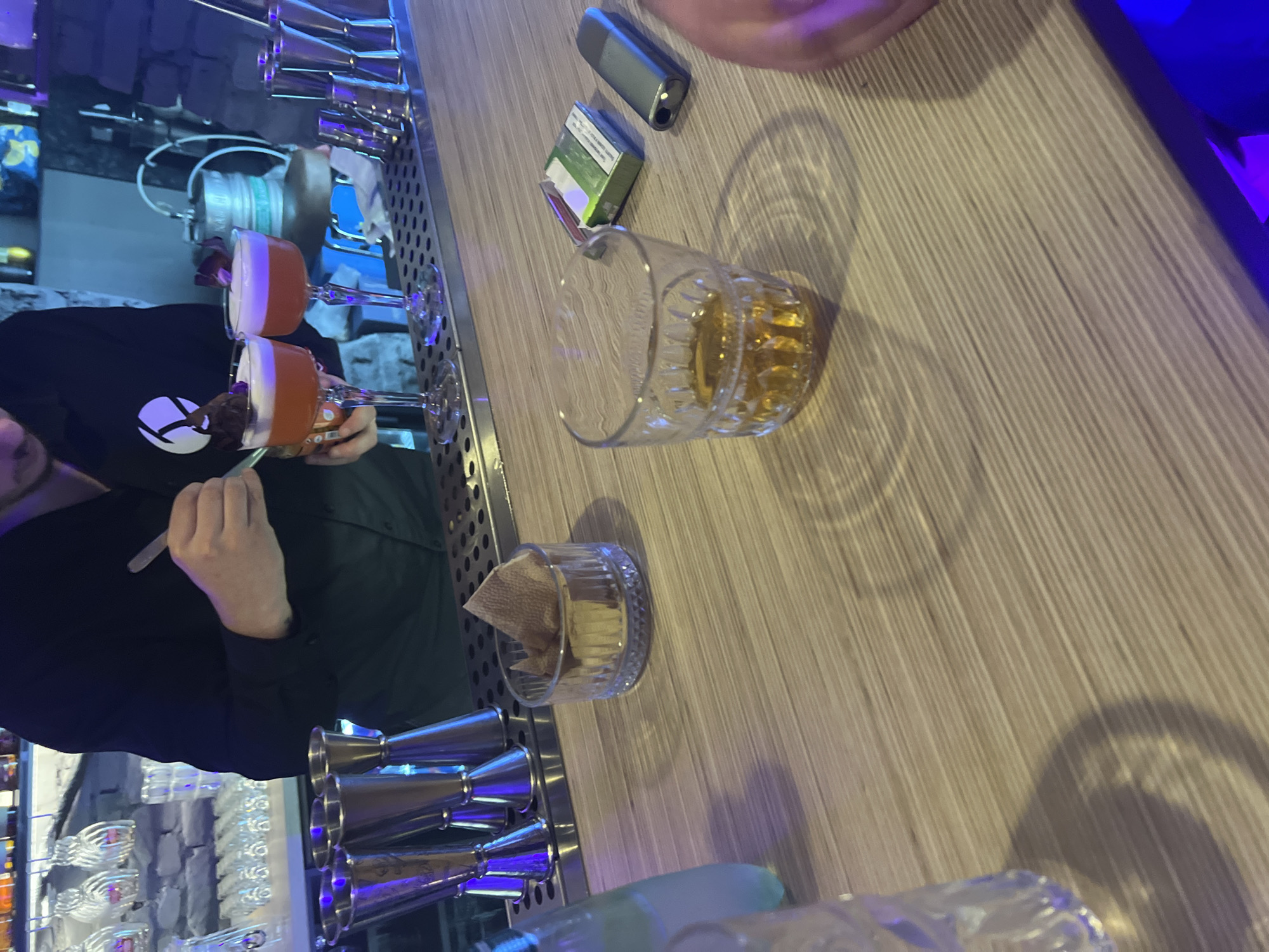 bar scene, possibly in Sliven, Bulgaria, with a bartender preparing cocktails. Two cocktails are visible, one with a decorative chocolate topping, alongside an empty glass with residue of alcohol, perhaps whiskey. There's a packet of cigarettes, and an electronic cigarette on the bar counter. The bartender, wearing a black top, is using a tool (likely a spoon) to garnish or mix a drink. The background features bar equipment and shelves with glasses and bottles, typical of a bar setting.