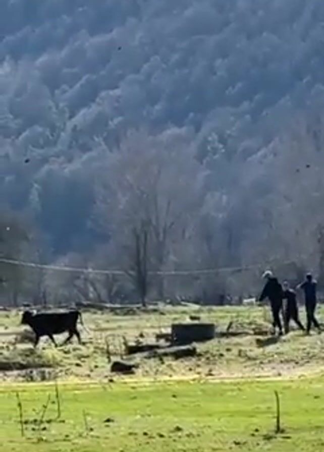 In a daytime, outdoor shot, three people and a black cow are visible in a field of green grass. In the background, there is a hill covered with trees. The cow is walking to the left of the frame. The three people are standing to the right of the frame, next to some concrete blocks and a white power line. The person in the middle is wearing a white hat. The other two people are wearing dark clothing. All three of them are looking at the cow. The overall scene appears to be rural or agricultural. There are also dark dots throughout the background, likely birds.