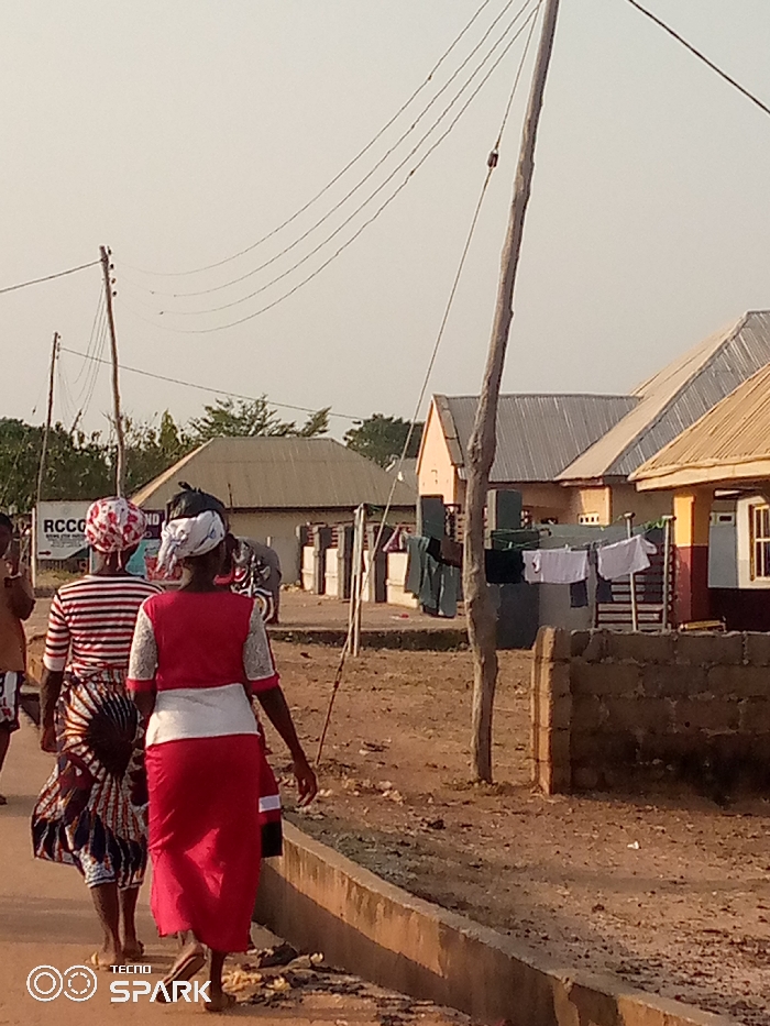 Two women walk away from the camera, along a dirt road with a concrete curb. One wears a striped shirt and colorful skirt, the other, a red and white outfit with a matching headscarf. Laundry hangs outside the houses. Utility poles and wires stretch across the sky. A sign with the letters "RCCG" is visible. The scene takes place in a village. The sky is light and overcast.