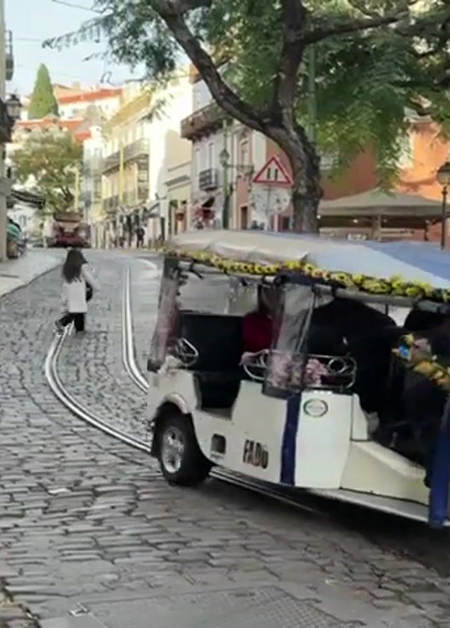 street scene in Lisbon, Portugal. The street is paved with cobblestones and includes a tram track that forks into two directions. In the initial frame, a white tuk-tuk decorated with flowers, featuring a blue canopy and the word "FADO," is positioned on the right side of the frame. A woman is seated in the driver's seat. A person in a white coat crosses the street on foot. As the video progresses, the tuk-tuk moves out of view, and more pedestrians are seen walking across the tram tracks. A street sign, buildings, and a small park area are visible in the background. The sky is bright, suggesting a sunny day.