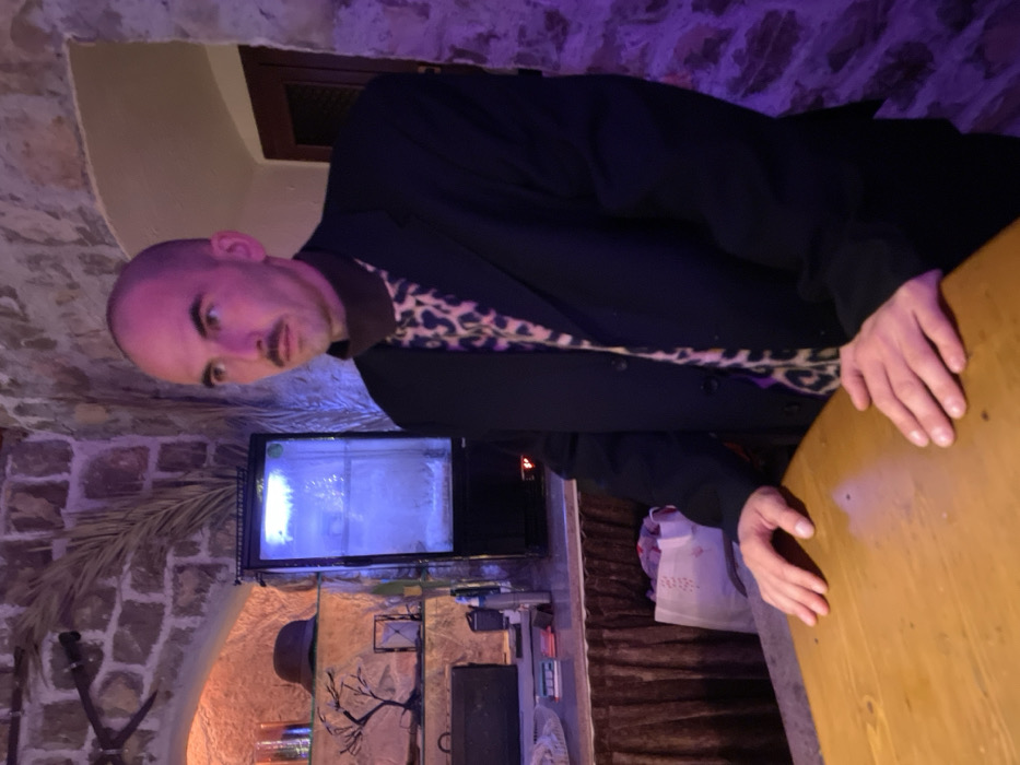 A man stands next to a wooden table. He has a bald head and is wearing a black jacket over a leopard-print shirt. His hands rest on the table. Behind him, a stone wall curves upwards, leading to a ceiling. A television is mounted on the wall, displaying a blue light. Various decorative items, including a hat and tree drawing, are placed beneath the TV. The overall lighting is dim, with purple hues illuminating the upper portion of the wall.