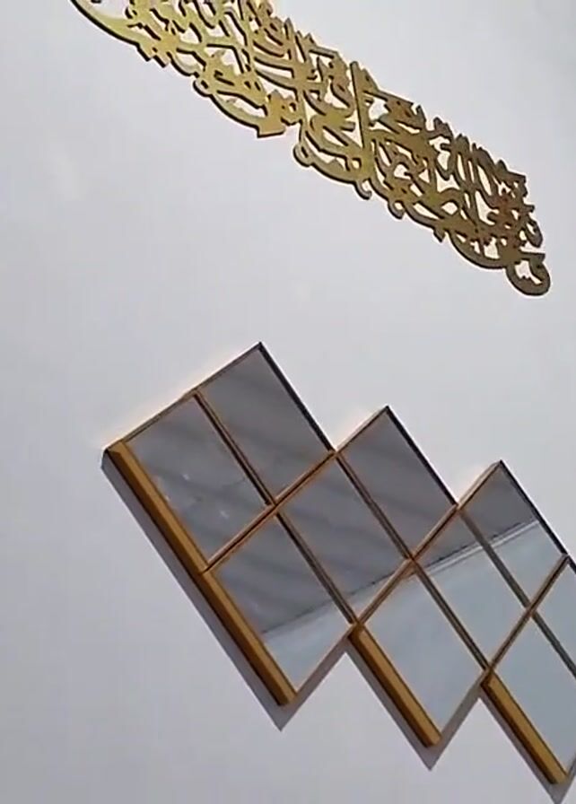 white wall with two decorative items. A gold-colored, ornate Arabic calligraphy piece is mounted near the top of the frame. Below it is a set of nine square mirrors with gold-colored frames, arranged in a zig-zag pattern. The camera angle is tilted upwards. Distant sounds of people, including a child's voice, can be heard.