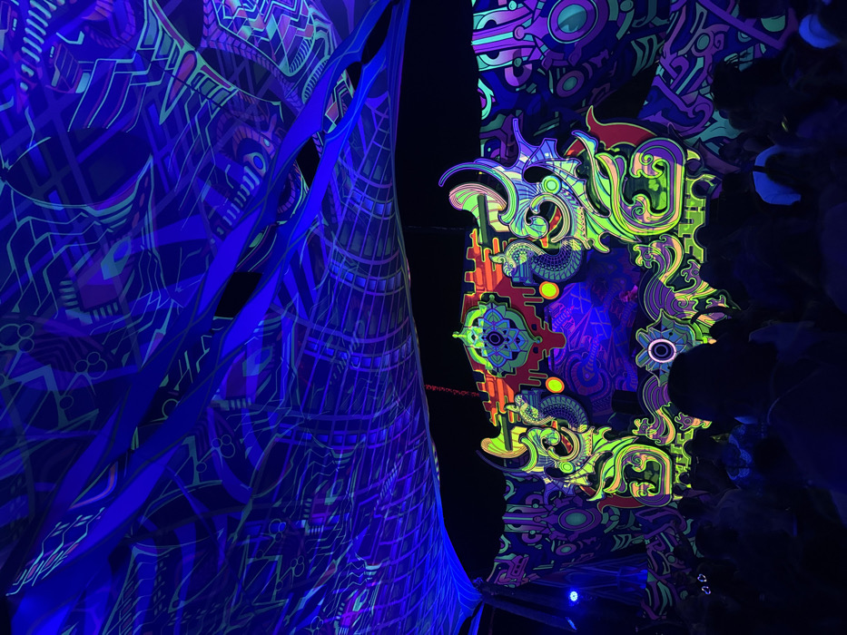 A dark space illuminated by vibrant, psychedelic artwork. On the left, a flowing, tent-like structure features intricate blue and purple patterns. To the right, a decorative panel glows with neon green, orange, and purple designs, resembling a fantastical frame. The overall effect is a surreal and immersive visual experience, likely within a club, festival, or art installation.