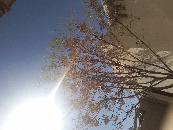 A sun-drenched scene captures a deciduous tree with sparse foliage against a clear blue sky and a light-colored building facade. The sunlight flares prominently in the lower left corner, creating a bright glare. The tree's branches, some bare and some bearing yellowed leaves, extend across the frame, casting shadows on the building's surface. The building, possibly an apartment or office, features subtle architectural details. The overall impression is one of late autumn or early winter.