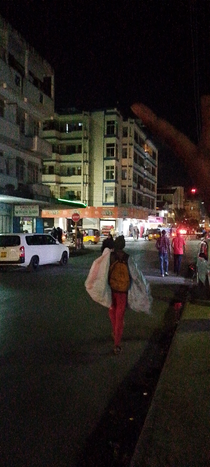 The image depicts a nighttime street scene within an urban area of Mombasa, Kenya