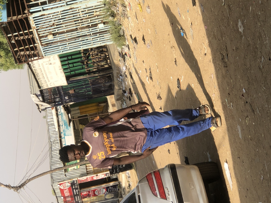 This image depicts a sunlit, unpaved street in Dabawa, Nigeria, featuring one male subject and commercial structures