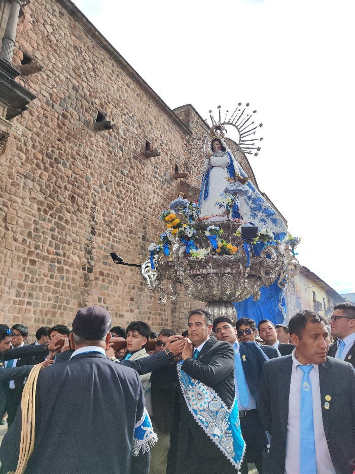 A religious procession carries a statue of the Virgin Mary adorned with blue and white robes, a crown, and silver detailing. The statue is also decorated with flowers. Men in suits and light blue ties carry the statue on a silver platform, with a brick building visible in the background. The sky is overcast.