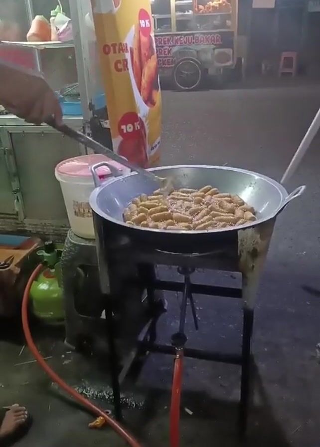 street vendor frying sausages in a large wok over a gas stove. The vendor, wearing dark jeans and sandals, uses a large slotted spoon to stir the sausages in the hot oil. A green gas tank sits next to the stove, connected by an orange hose. A food cart with advertising for "Sosis Crispy" is visible in the background, along with another food cart. The scene appears to be at night on a street with some passing traffic.