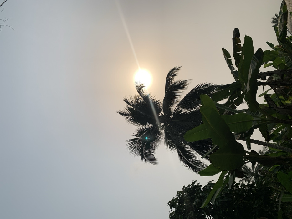 The image captures an outdoor scene in Ikot Ete Ekpo, Nigeria, under a hazy, light grey-blue sky