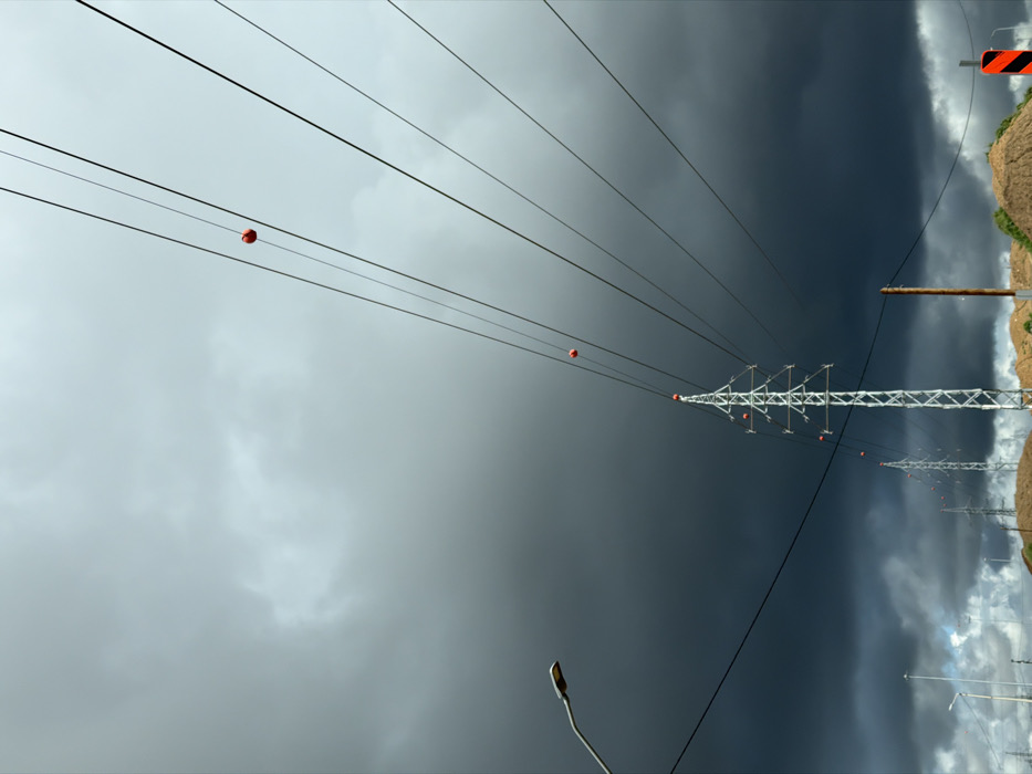 The image displays an outdoor environment within the Hevel Yavne Regional Council, Israel, under a predominantly dark, heavily overcast sky. The upper portion of the sky is lighter grey, transitioning abruptly to dense, dark storm clouds that occupy the majority of the background. Multiple parallel electrical power lines stretch diagonally across the frame from the upper right to the lower left. Several orange spherical marker balls are visible on these lines, with one prominent in the upper right and another positioned above a primary transmission tower. A tall, metallic lattice-structure electrical transmission tower stands in the middle-ground, slightly left of center, supporting numerous lines with visible insulators and orange markers at its apex. A series of similar but smaller transmission towers recedes into the distant background. To the far left, a grey streetlight fixture extends into the frame. The foreground features several irregular mounds of light brown earth or sand. A dark brown vertical pole is located in the lower right, with a partial view of a red and black striped road marker adjacent to it on the far right. No individuals are present in the scene.