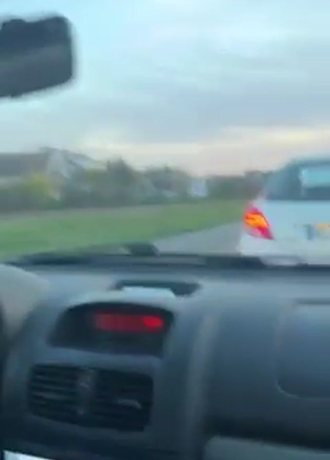 interior of a car driving on a road surrounded by greenery and buildings. The camera focuses on the dashboard and occasionally shows the driver, a man with dark hair and a beard, sitting behind the wheel. The car appears to be following another vehicle in front. The video is shaky.