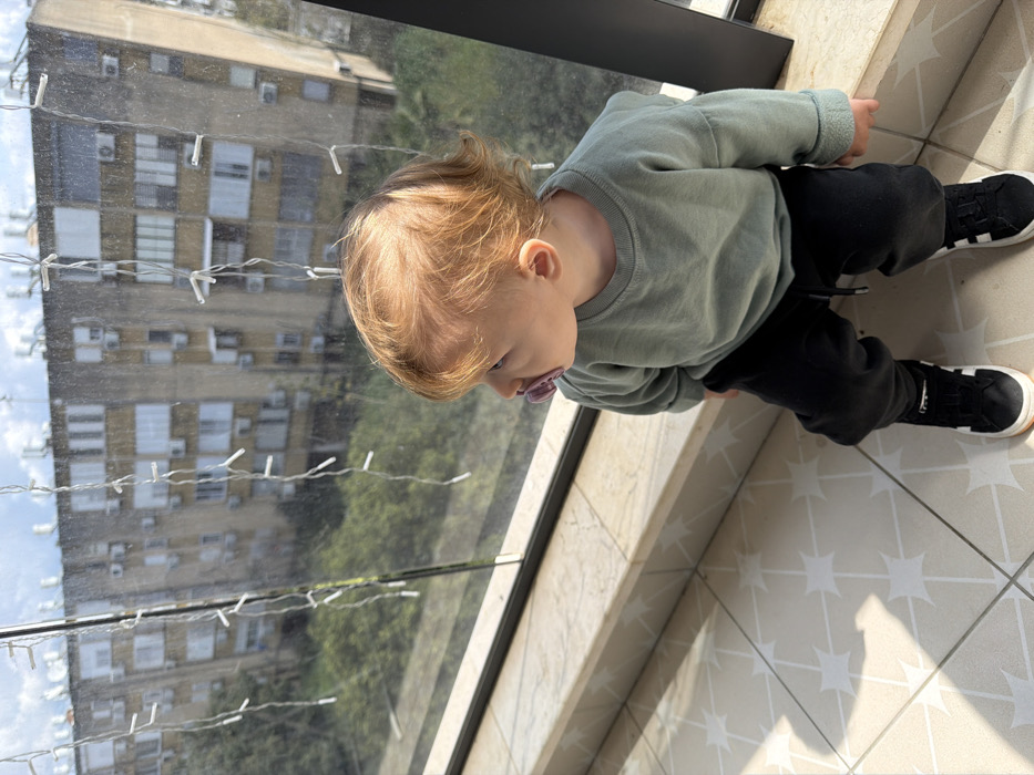 An image captured in Kiryat Bialik, Israel, depicts a young child in profile, positioned on an indoor tiled floor next to a large window