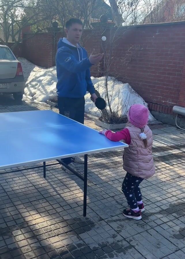 A man and a young girl are playing ping pong outdoors on a sunny day. The man, wearing a blue hoodie and dark pants, serves the ball to the girl, who is wearing a pink hat and vest with patterned leggings. They are playing on a blue ping pong table set up on a brick-paved area. There are several cars parked nearby, and a brick wall and some melting snow are visible in the background. After the girl misses the ball, the man walks away from the table.