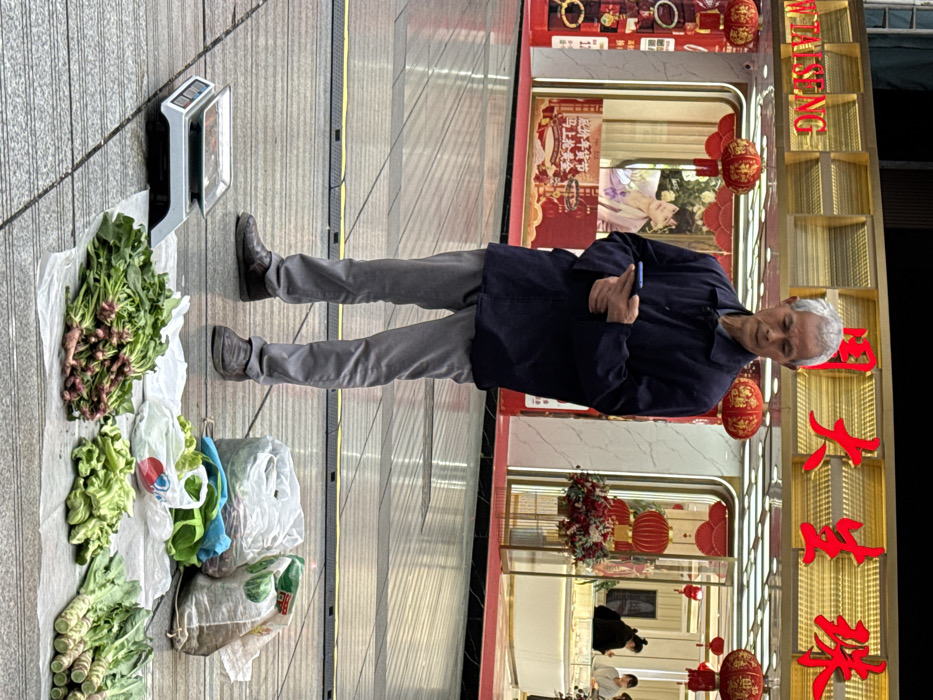 An elderly Asian male stands in an urban outdoor setting in Beibei, China, in front of a "Zhou Dasheng Jewelry" store