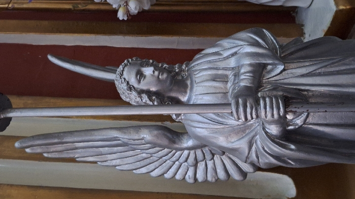 A silver angel statue is depicted horizontally, facing left. The angel has wings and is holding a silver pole. The background includes a red surface above a white and gold design. There are some white flowers above the red background. The statue and setting seem to be part of an ornate interior.