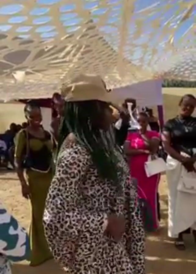 group of people, mostly women, gathered under an open tent-like structure with large, circular cutouts providing a view of the blue sky above. The setting appears to be an outdoor event with sandy ground. The central figure, facing away from the camera, wears a leopard-print maxi dress, a beige hat, and has long, green-tinged braids. She holds a small black purse on her shoulder. Several women stand around her, some smiling, others more reserved. The clothing styles vary, with some in long dresses and skirts, and others in more casual attire. A man stands in the background, visible between the women. There is music playing, with audible singing and a prominent beat. The overall atmosphere appears celebratory or festive.