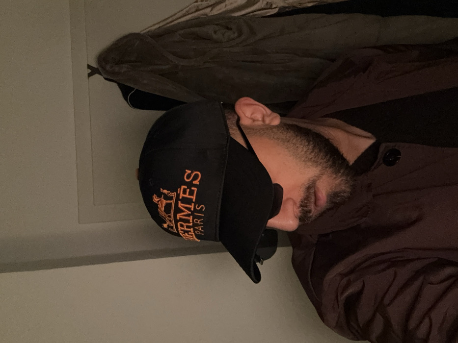 A man wears a black baseball cap with orange lettering and the Hermès logo. He's wearing sunglasses and a dark brown jacket. He has a beard. The lighting is dim. Part of a beige or grey jacket is visible in the background. A white wall panel appears on the left side.
