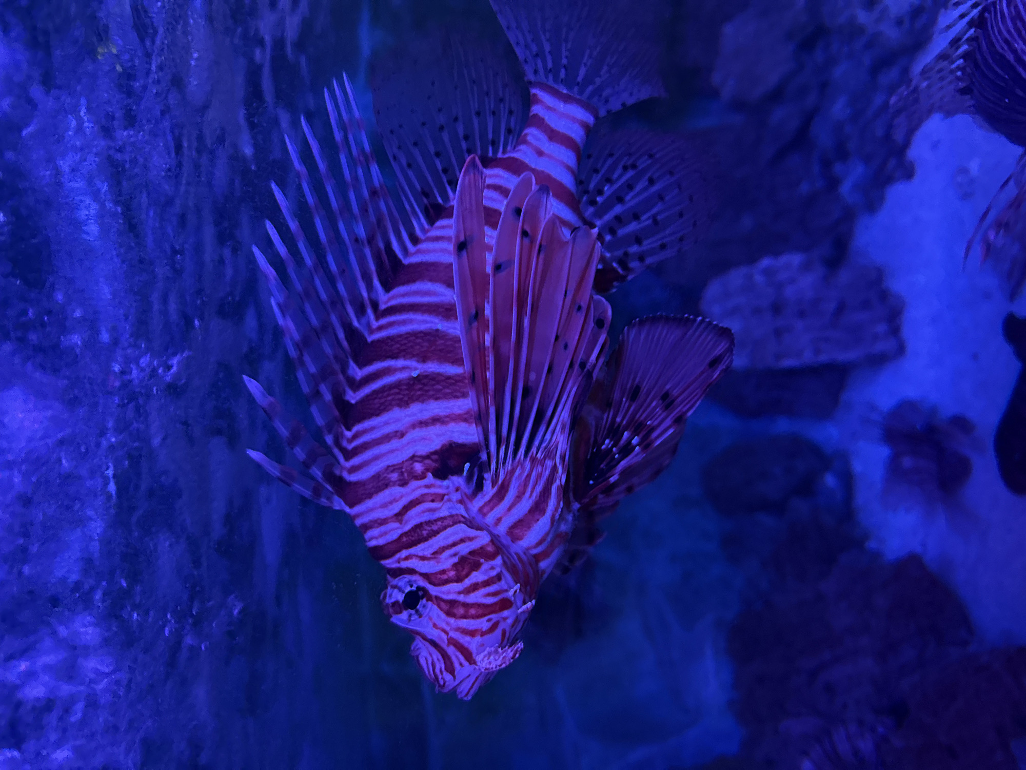 lionfish in a tank, likely at an aquarium