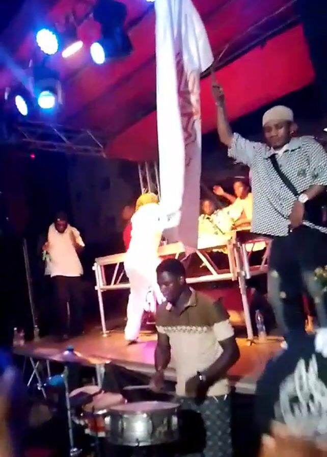 Here's a detailed description of the video: The scene captures a live musical performance on an elevated stage, under the vibrant glow of blue and white stage lights. A percussionist in a tan-and-brown collared shirt and patterned pants is focused on playing a drum. On the stage, other performers are present: One is wearing a white outfit, while another is in an orange jumpsuit. A man in a checkered shirt, jeans, and a white cap waves a large white banner with red text. There's another man in a black shirt, cap, and gold chains, with his back to the camera in the foreground. The environment is that of a lively venue, and the red and black stage backdrop suggests a concert or event setting. The camera appears to be handheld, adding to the raw and immersive feel of the performance.