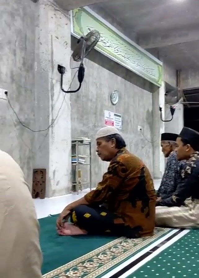 Several people are sitting on the floor of a mosque, apparently engaged in a religious activity