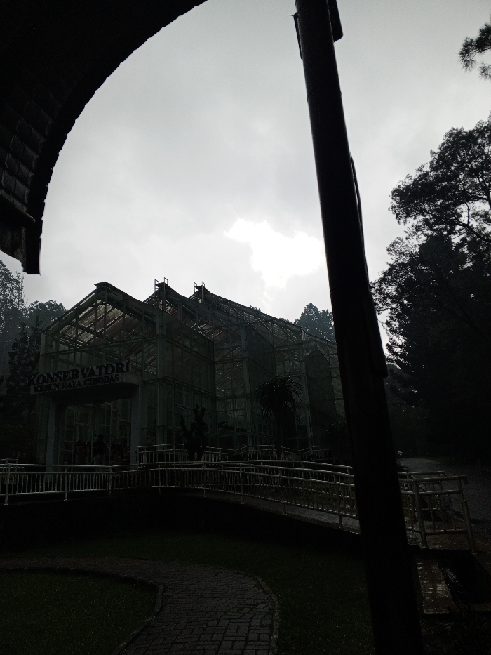 The photograph shows a conservatory, possibly a botanical garden structure, on a gloomy day. The building is primarily glass and metal framework with signage partially visible above the entrance. A metal railing bridge leads to the entrance. Trees and foliage surround the structure, adding to the dense, overcast atmosphere. The composition is framed by dark, unidentifiable objects in the foreground, adding depth and a sense of enclosure. The overall mood is subdued and mysterious.