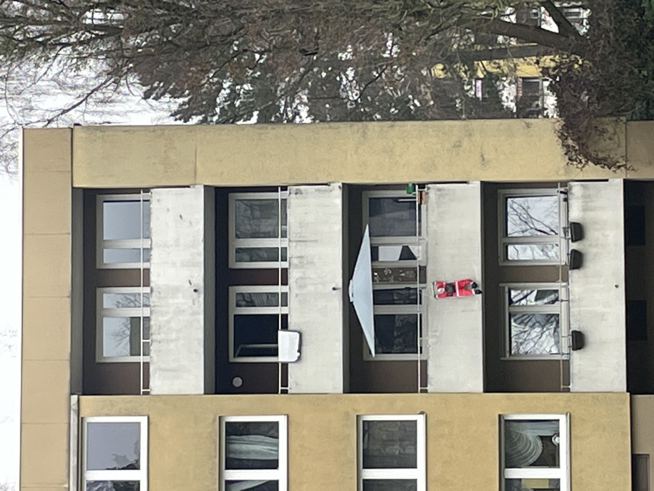 The image depicts the vertical facade of a multi-story residential building located in Nuremberg, Germany, observed on an overcast day. The building exterior is primarily a light brownish-yellow hue, with a prominent section of white concrete balconies featuring thin white metal railings. From top to bottom, the visible sections include: * A top floor with two closed windows reflecting bare tree branches. * The first balcony level below, with two closed windows behind it, also reflecting bare branches. * The second balcony level below, where a white towel is draped over the left section of the railing. One window to the left is open inwards, while the window to the right is closed, reflecting a bare tree. * The third balcony level below, which features a light blue open parasol positioned towards the center-right. Suspended from the exterior face of this balcony, below the railing, is a large, red Santa Claus decoration, depicted in a climbing or descending posture with a white beard and black boots. A small green potted plant sits on the far right of the balcony floor. * The fourth and lowest visible balcony level has two dark brown rectangular flower boxes attached to the exterior of the railing. Two closed windows behind it reflect bare tree branches. To the right of the building, a large deciduous tree with bare branches dominates the background, suggesting a cold season. Its intricate branch structure is clearly visible against the muted sky, and smaller, denser evergreen foliage is partially visible behind it. The overall lighting is soft and diffuse, consistent with an overcast sky. No individuals are visible in the scene.